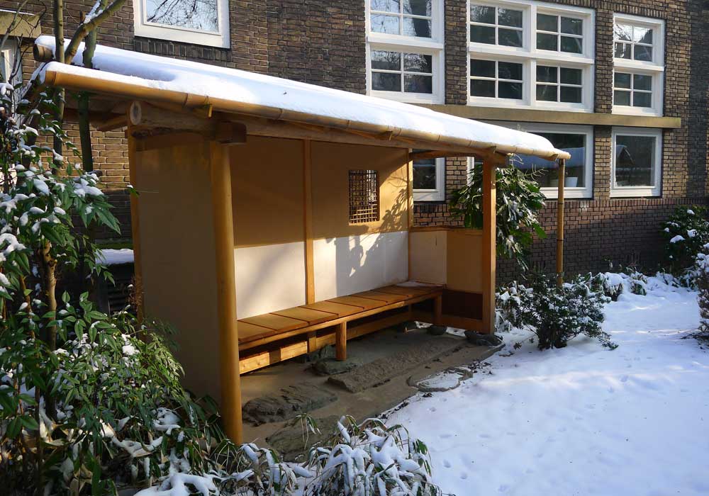 - De bibliotheek vanuit de Japanse tuin.